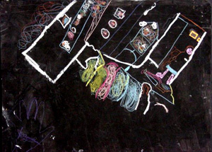 Morgane, crayon de couleurs, gouache blanche, sur feuille peinte à la gouache en noir.