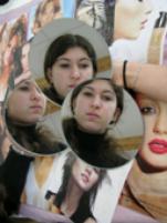 | "Pour cette photo, j'ai voulu utiliser deux miroirs différents. Dans l'un se reflète l'image de l'autre. j'ai voulu me représenter de manière à) ce qu'on me voit plusieurs fois, de façons différentes. J'ai utilisé un miroir avec un entourage en mosaïque rose pour donner de la couleur et, ainsi, pouvoir légèrement déformer mon image." Mélissa |