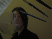 | "Des partitions et des pinceaux afin de monter mon attirance pour ces deux domaines ; la partition, je la joue en ce moment et puis trois pinceaux parce que j'aime ce chiffre. Mon visage est reflété par le CD ce qui donne l'impression d'un masque car lorsque je joue de la musique, j'ai l'impression d'être une autre personne, qui fait plus ressortir ses émotions par l'intermédiaire de la musique. La lumière est assez faible, afin de montrer les moments où je doute de moi... "Charline | |
