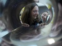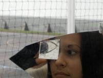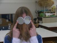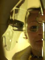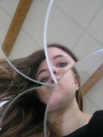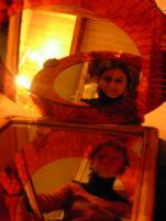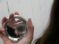 | "J'ai pensé à me servir des deux miroirs pour déformer mon visage, de façon à faire apparaître mon nez de profil sur les côtés de mon visage. En modifiant l'inclinaison des miroirs j'ai constaté que mon visage se reflétait plusieurs fois, en cercle.Pour accentuer l'idée de rondeur, j'ai décidé d'utiliser un troisième miroir.J'aimerai pouvoir donner un format carré à la photo".Chloé |