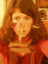 | "Les cheveux sont ramené en avant, des miroirs comme des lunettes sont devant les yeux, ils ne reflètent rien de précis. Les indexes comme des poins de part et d'autre des miroirs qui ne reflètent rien, ce qu'il y a dans ma tête peut-être ? Les doigts tendus font une sorte de symétrie. J'ai voulu me cacher derrière mes cheveux, les miroirs, mes mains".Gaëlle | |