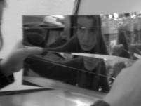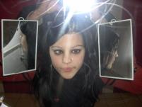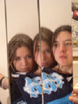 | "Je tiens deux miroirs dans mes mains et je suis face à un troisième. Grâce au flash de l'appareil, il y a des rayons de lumière sur l'image.Mon reflet n'est pas comme je l'aurais voulu mais l'effet voulu est donné". Ludivine | |