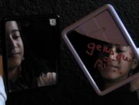 | "J'ai voulu faire passer le message d'une personne qui aime la vie, qui aime la joie mais qui, à l'intérieur d'elle, ne se sent pas bien (jeux avec la couleur noire et le rouge du rouge à lèvres). Il y a peu de couleurs et peu de lumière, il y a juste un peu de couleur avec le message écrit sur le miroir. Le message est aussi dans la cassure du miroir. La lumière est un peu réfléchie par le visage." Nadia |