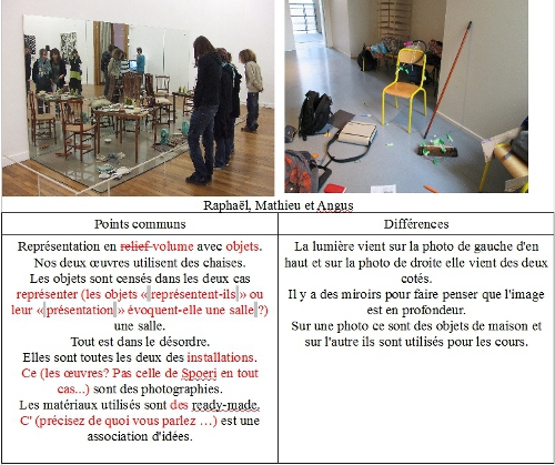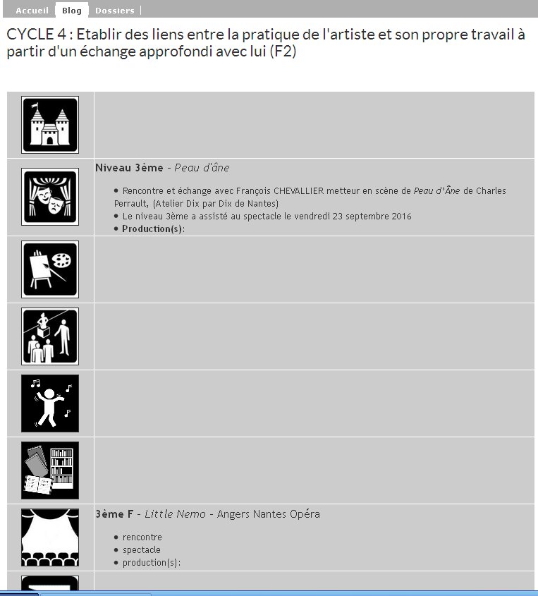 La page de la classe offre aux élèves une navigation interactive sur le site. Ils peuvent travailler de nouvelles questions à travers des formulaires, retrouver des traces de productions et des références artistiques vues en cours, des liens vers des sites choisis par l'enseignant, le contenu des verbalisations, les mots clefs articulant la réflexion, pointant les notions en jeu, des document à parcourir, etc.