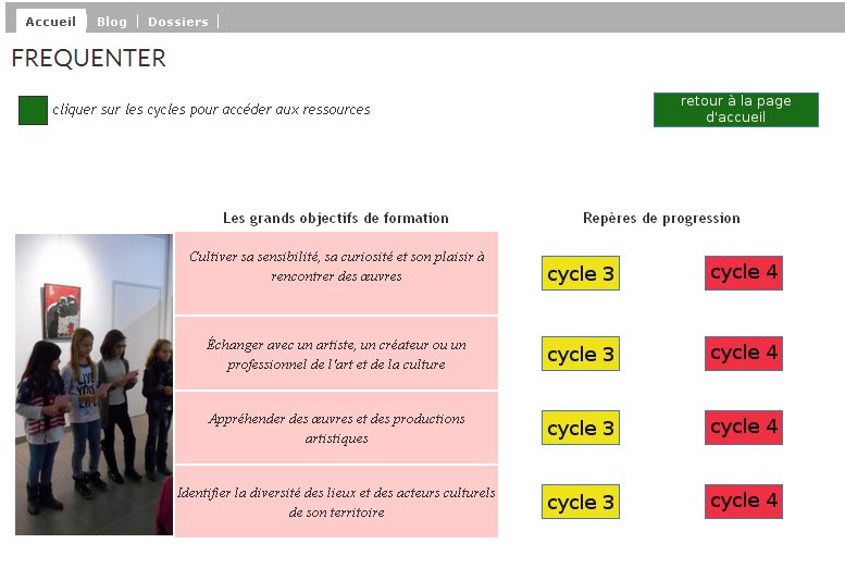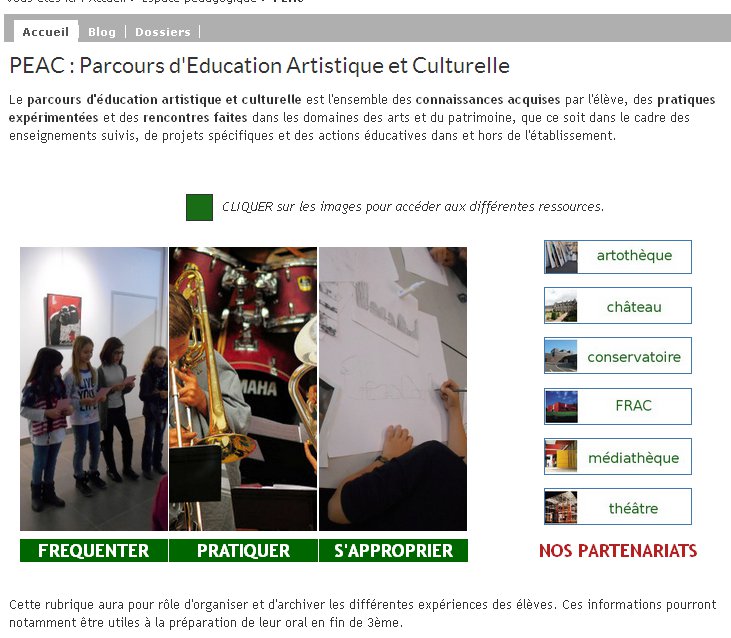 Le site peut servir d'outil d'organisation et d'enrichissement du Parcours d'Éducation Artistique et culturel qui s'appuie principalement sur les disciplines artistiques. Les enseignant peuvent ainsi présenter le travail des cohortes d'élèves sur les quatre années du collège, voire partager un espace avec les écoles et les lycées. Les rubriques créées proposent des ressources utilisables par les élèves et les enseignants notament lors de la préparation de l'oral de troisième. Le téléchargement des fichiers, leur stockage par les élèves, la manipulation des documents, la redirection vers des sites institutionnels pour constituer un dossier et approfondir est ainsi facilitée.