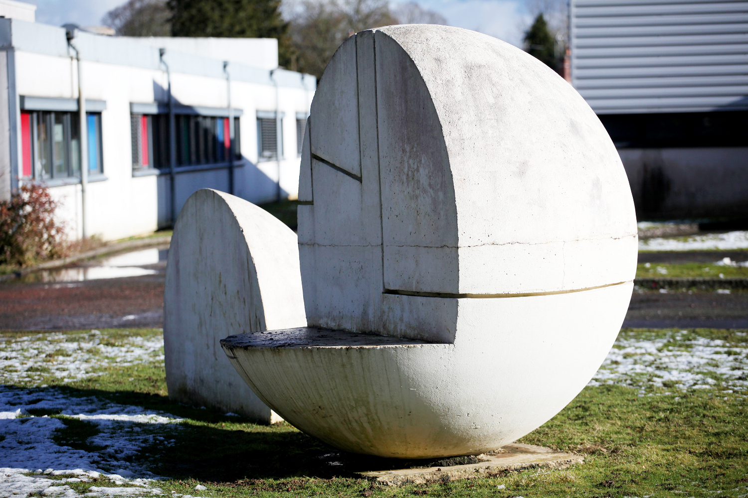 Cette œuvre de Michèle GOALARD est constituée de 13 sphères en béton de taille différente peintes en blanc et d’une sculpture évoquant une femme au centre. Certaines sphères sont comme éclatées et le spectateur peut mentalement les reconstituer. L’artiste a pensé cette œuvre comme un dialogue avec le paysage. En effet, elle a mis en place des buttes avec les restes des fondations du bâtiment du collège, puis disposé dans cet espace ses sculptures. Pour cela, elle a lancé des billes sur une maquette reproduisant cet espace et le hasard a choisi la disposition. (Les sphères sont surtout placées dans les creux, assez serrées.) Les deux cèdres du Liban déjà en place dialoguent aussi avec cette œuvre. L’artiste a pensé cet espace comme un lieu de rencontre de détente pour les élèves et les usagers de la cité scolaire. D’après les personnes ayant connu l’œuvre à son origine les sphères étaient peintes, et plus étalées dans la cité (les deux plus grandes éclatées était à l’entrée du collège.) Les sphères sont repeintes et nettoyées en blanc tous les deux ans environ par les agents de la cité scolaire.