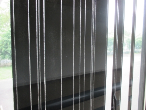 L’œuvre in situ est abstraite. Elle est réalisée entre deux vitres d'une galerie vitrée. Les lignes verticales noires plus ou moins large et plus ou moins espacées semblent gravés à l'intérieur du double vitrage.