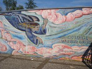 Une immense fresque réalisée en mosaïque s’étend sur le mur d’entrée du collège Wilbur Wright de Champagné en Sarthe, elle mesure 25 mètres de long sur 2.30 m de hauteur. Cette représentation allégorique évoque pour l’artiste Mosca De Selva, un hymne à la vie ; le thème de l’envol récurrent pourrait aussi faire écho au personnage de Wilbur Wright célèbre aviateur américain, qui a fait des essais de vols au camp d’Auvours à Champagné au début du XXème siècle.