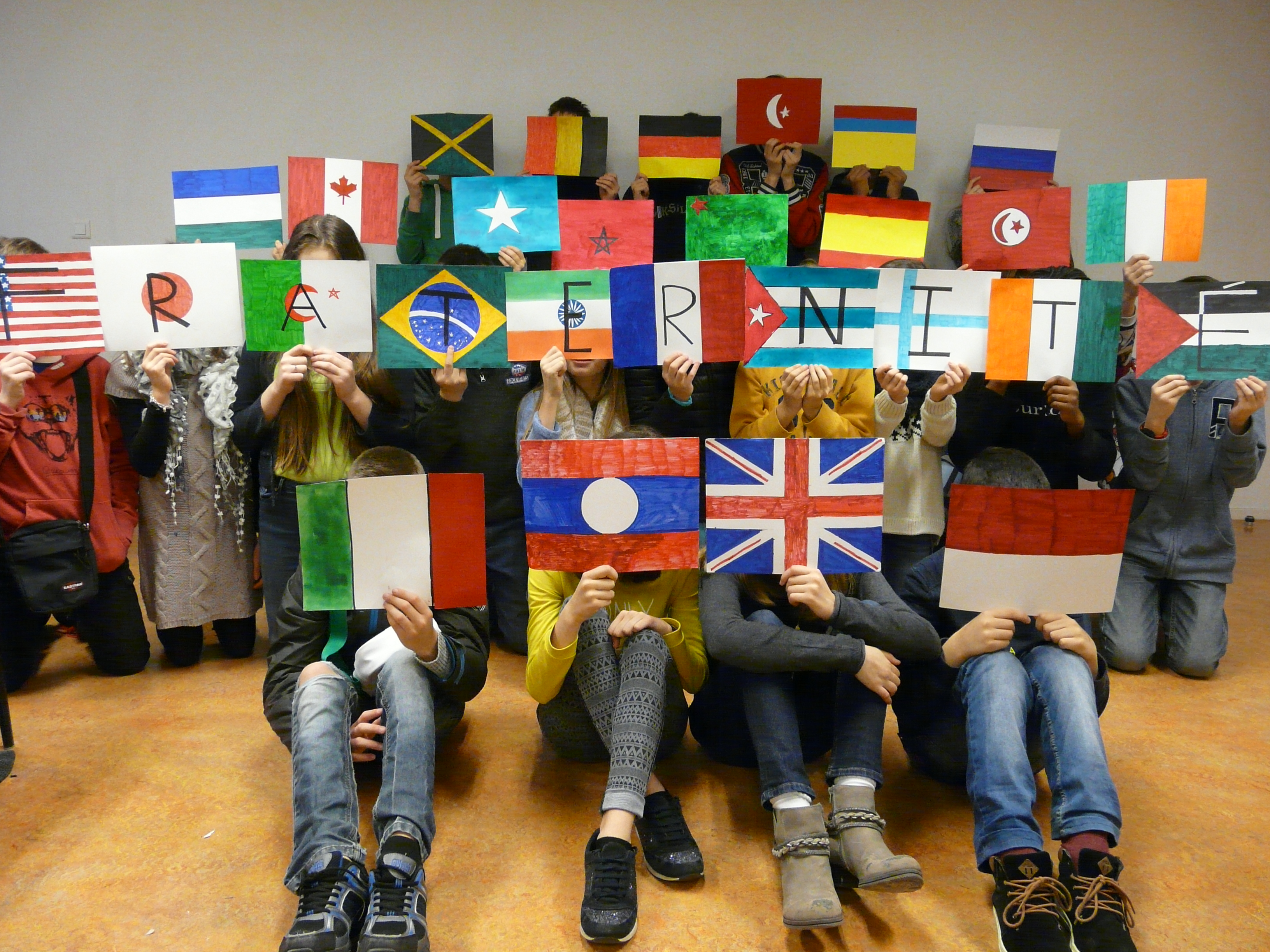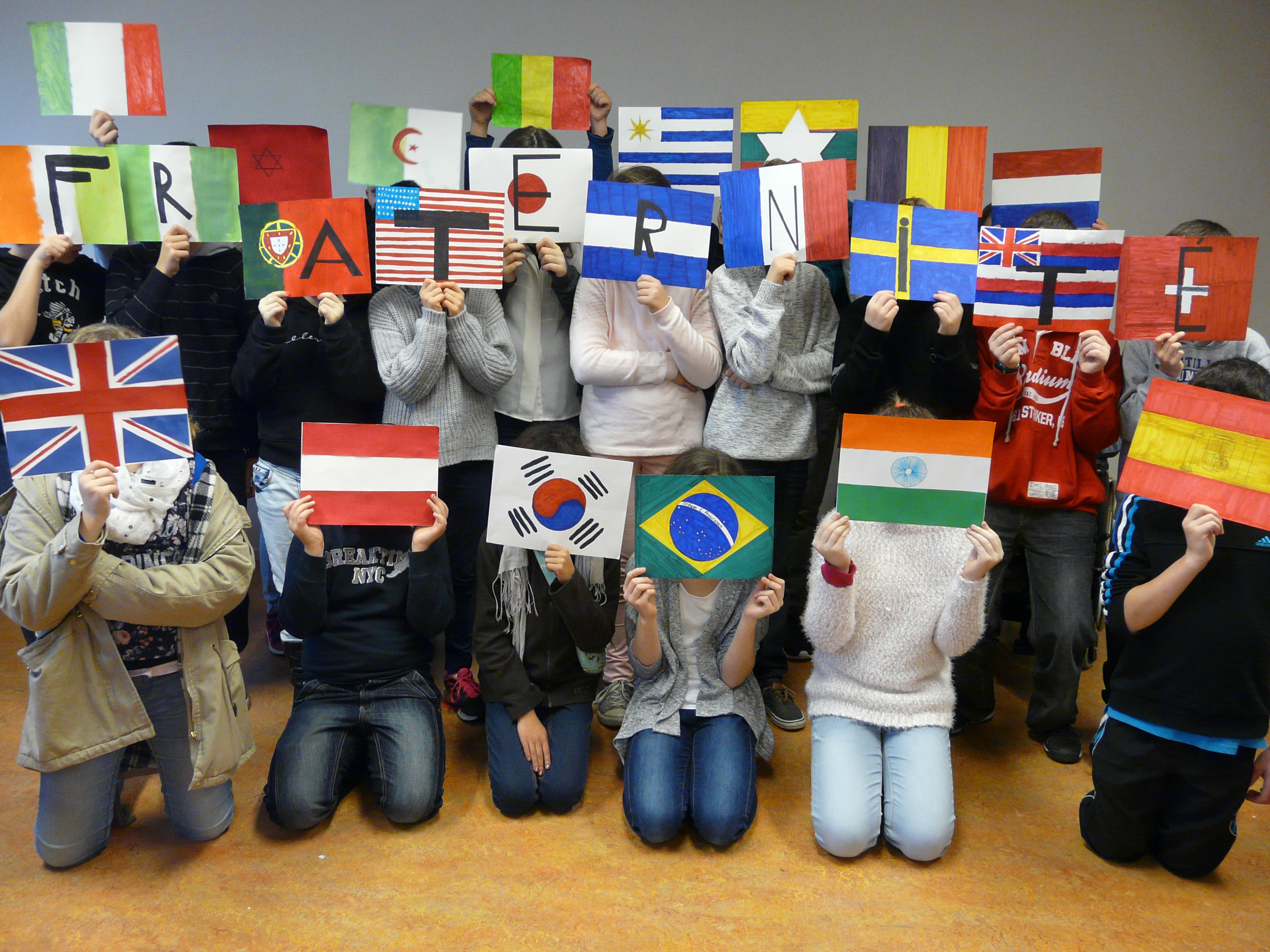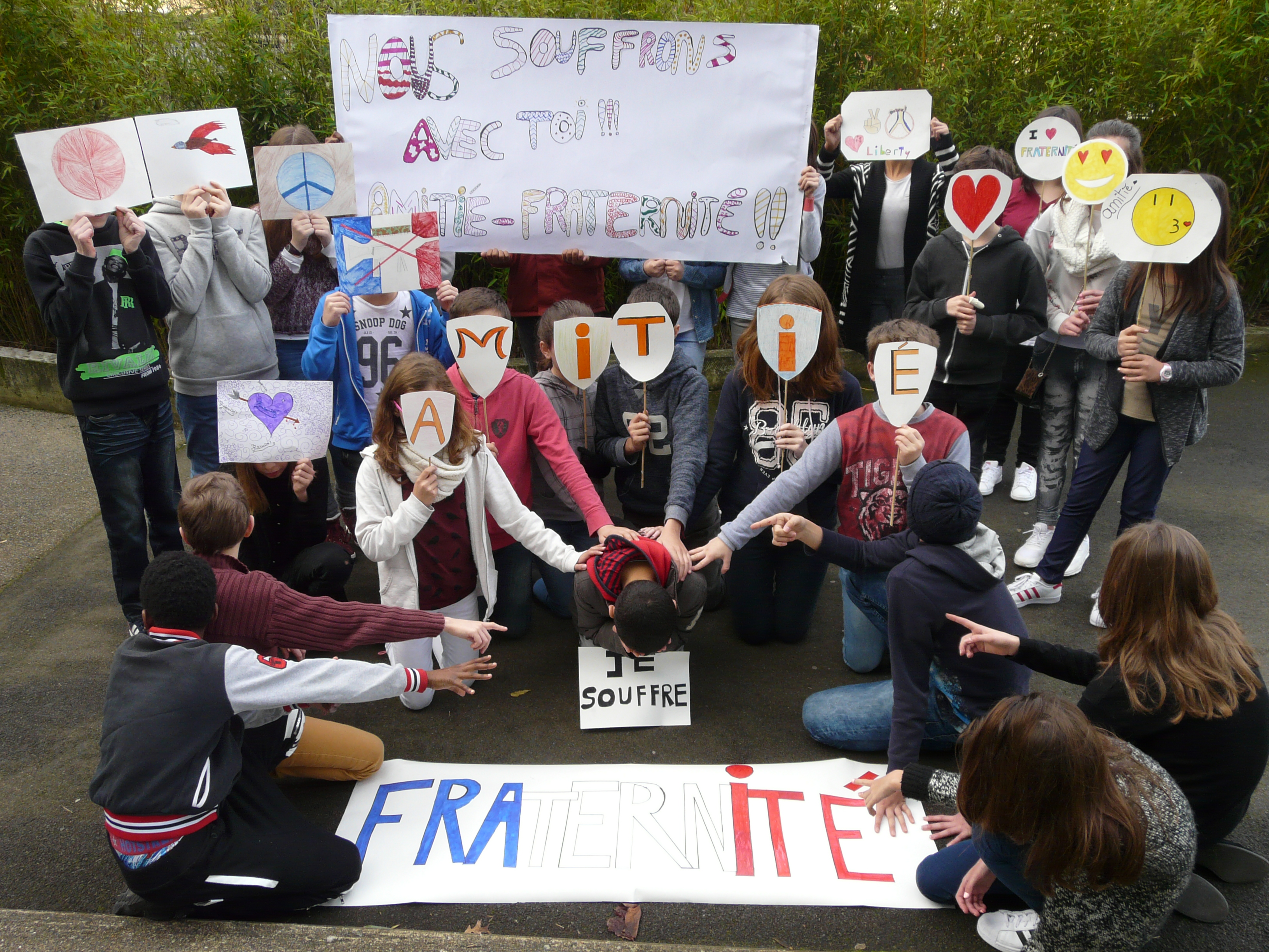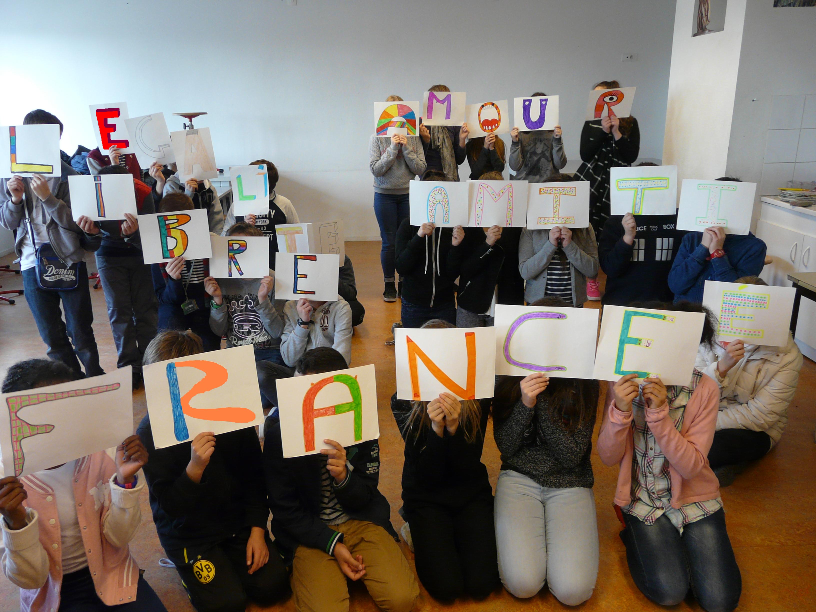 Après un débat sur la notion de Fraternité puis un échange de vocabulaire, les élèves ont imaginé un projet par groupe de 5- 6 élèves autour de l'incitation proposée " de la peinture à la photographie". Chaque projet a été présenté à la classe par un travail graphique et une présentation orale. Un choix d'un des projets proposés sera effectué dans chaque classe.