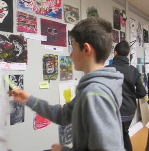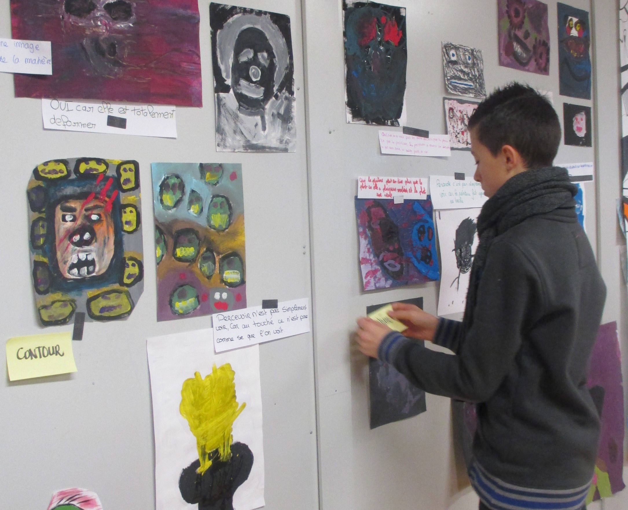 Regarder, analyser et penser seul. Cette situation oblige l'élève à observer l'ensemble des travaux. C'est un moment de réflexion personnelle après un regard attentif. Il prend le temps d'accrocher son écrit en regard du travail qui le sous-tend.