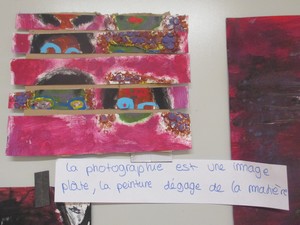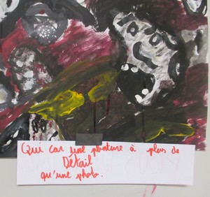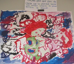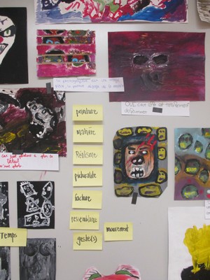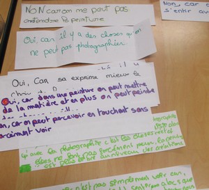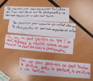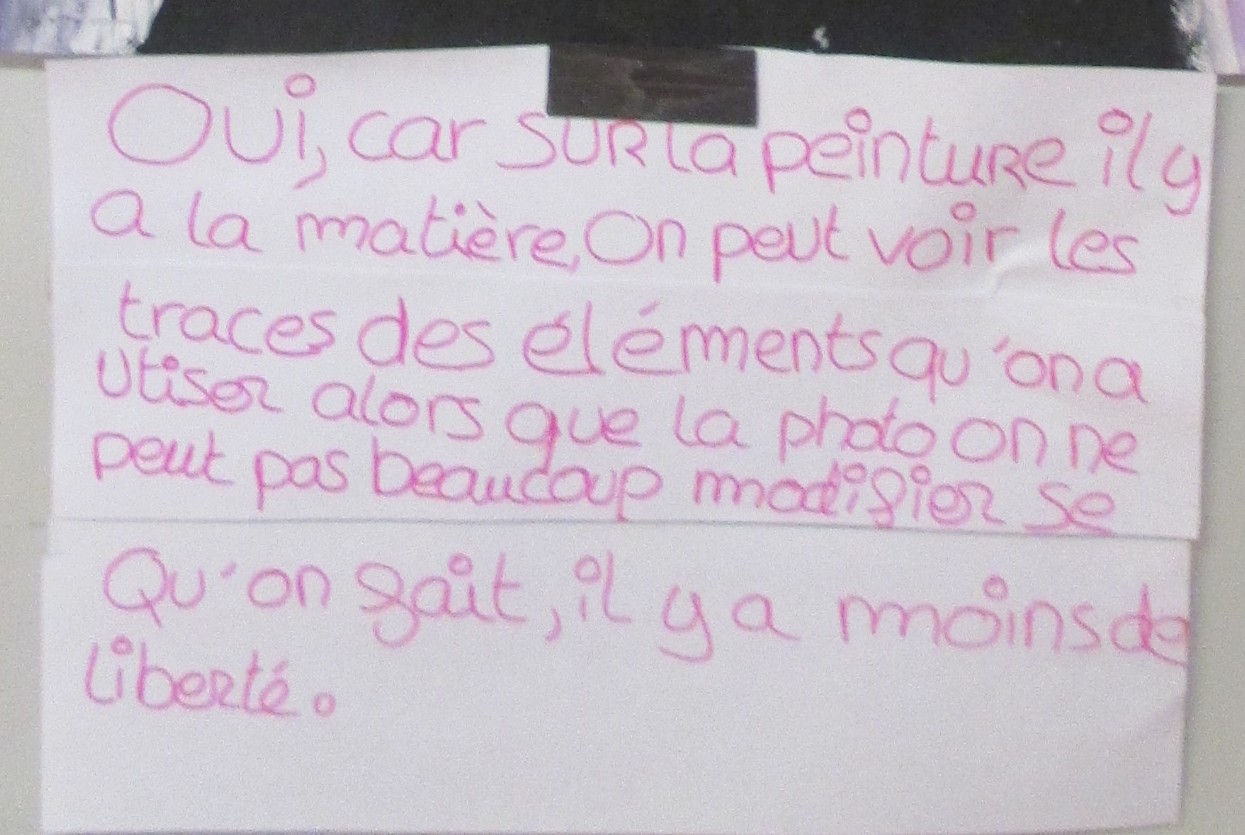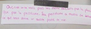 Des bandelettes de papier et des feutres sont à disposition sur les tables. Les élèves observent les productions au regard des 2 questions. Après réflexion, ils écrivent, répondent aux questions et vont accrocher leurs phrases à côté d'une peinture à même d'éclairer leurs propos.