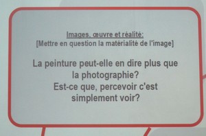 En relation avec les trois maîtres mots du programme, Image, oeuvre et réalité, il s'agissait de questionner la peinture, image picturale, au regard de la réalité, de la vérité, de l'expression du réel et de la confronter à la photographie (travaillée antérieurement dans l'année). Cette proposition permettait de préparer une visite au musée du Prado à Madrid : la salle des "Pinturas négras " de Fransico Goya. et de repérer en quoi la matérialité de la peinture fait sens.