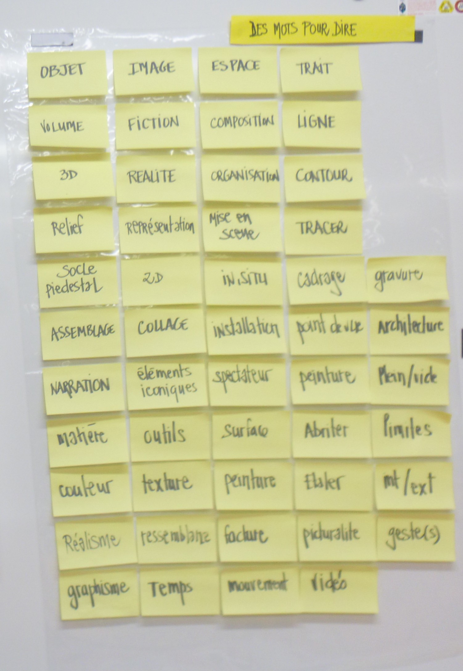 Un autre petit groupe d'élèves choisit des mots dans la "collection" accrochée en classe, afin de les intégrer aux "écrits mobiles". Cette collection de mots est en permanence dans la classe et peut servir à tout moment. Elle est constituée de mots incontournables recouvrant les notions permanentes : forme, espace, couleur, matière, lumière, temps, corps, image... Cette liste est modulable et s'enrichit en fonction des leçons proposées.