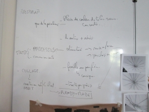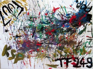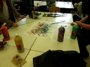 Une peinture effectuée par plusieurs élèves à "coups de baguettes" rythmés sur le support enduit de peinture. Ce processus a produit un effet hachuré particulier sur la surface picturale que les élèves ont évoqué lors des analyses...