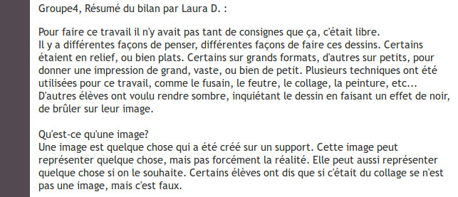 Il paraît important de mettre très vite les élèves en situation de s'en ressaisir. L'écrit est ici un outil précieux qui permet une réappropriation immédiate de ce qui s'est dit lors de la verbalisation : l'élève réutilise les mots découverts en y trouvant du sens parce qu'il les emploie pour décrire ou analyser de son point de vue une oeuvre qu'il vient de voir ou, plus encore, pour la mettre en relation avec son propre travail ou celui d'un autre.