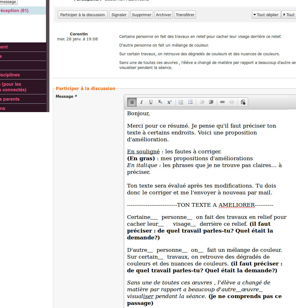 Cette approche a le double avantage de responsabiliser l'élève-secrétaire et de familiariser chacun, tour à tour, avec les nouvelles technologies de communication, la discussion avec le professeur ayant lieu par l'intermédiaire d'e-lyco. Bien sûr, on court le risque de mettre à l'écart de la verbalisation cet élève, ou de le mettre en difficulté s'il n'est pas à l'aise avec l'écrit, mais l'individualisation de la relation permet alors un accompagnement plus efficace dans la mise en oeuvre de solutions pour résoudre ces difficultés.