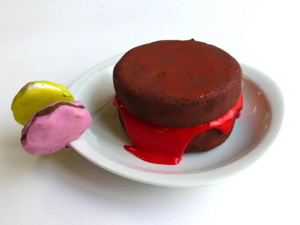 J'ai commencé par réaliser des macarons et une tablette de chocolat. Ensuite, j'ai pris ma mousse oasis et je l'ai découpée en forme de rond, que j'ai par la suite, découpé en deux. Entre les deux ronds, j'ai fait couler de la peinture pour imiter un coulis. J'ai obtenu mon grand macaron.