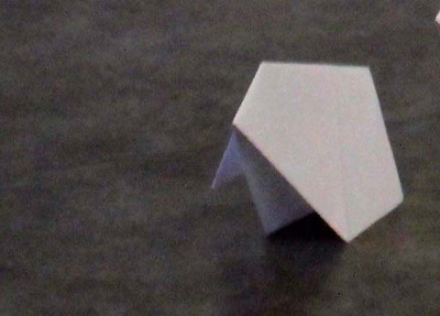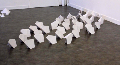Clément a plié des feuilles A3 de manière mécanique et a opté pour une présentation au sol de ses "cocottes". Elles semblent se suivre et envahir la salle d'exposition. La petite histoire que semble raconter cette production (pliage + installation) fait naître un peu de poésie malgré une production mécanique.