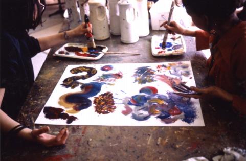 l'une est riche d'une expérience qui l'enferme, malgré la réussite apparente, l'autre, n'ayant pas de passé en ce domaine, est faible par son manque de métier mais expérimente largement et multiplie les trouvailles au point, souvent, de rattraper son "retard". Le transfert est donc à prendre ici dans double sens, éducatif et psychanalytique : chacune a des contraintes opposées : mettre en jeu leurs différences, travailler ensemble sur la petite gouache (ce qui suppose de nombreux compromis picturaux) leur fait implicitement espérer mieux comprendre les richesses de la partenaire et, sans doute, compter en faire usage ultérieurement. « Ne pas toujours faire la même chose », dit Laëtitia. L'expérimentation est permise sur le papier, mais il ne sera pas possible d'appliquer les trouvailles, comme le pense Carine, fidèle à sa posture, mais nécessaire de transposer, car tout est différent : format, conditions de travail, références, etc.