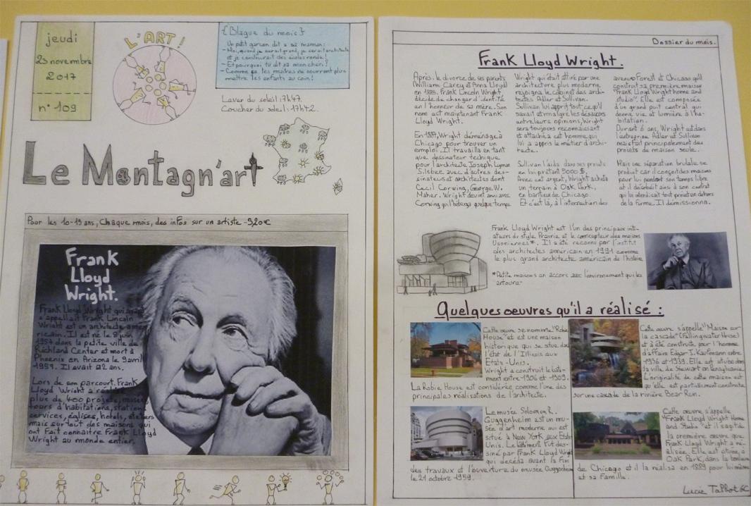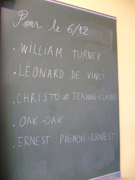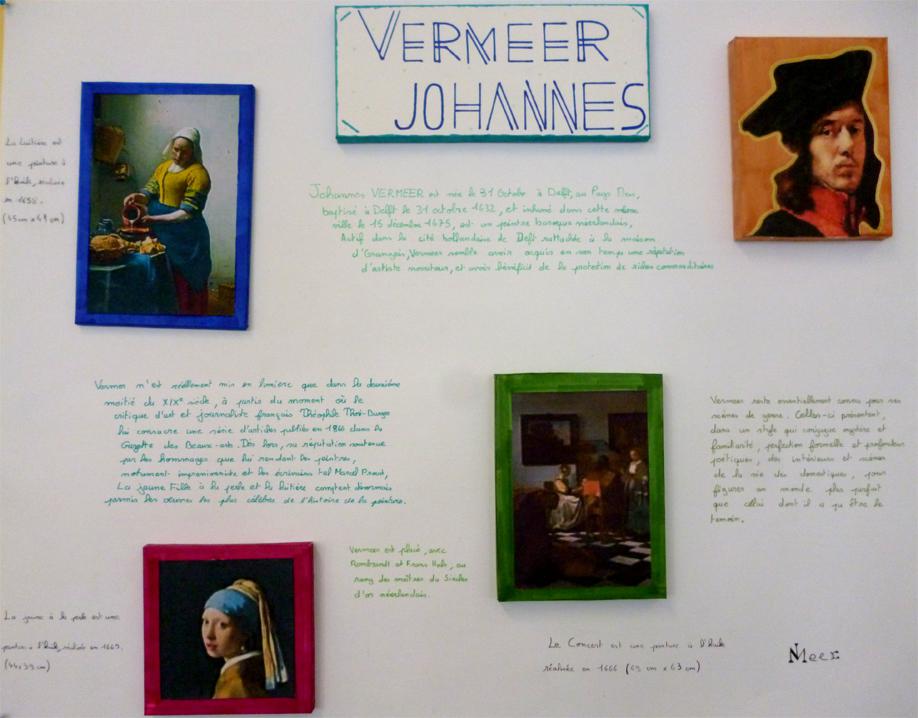 Chaque mois, il est demandé à des élèves volontaires de préparer un exposé écrit sur un artiste plasticien. Ils réalisent un support visuel pour présenter l'artiste choisi parmi les 5 noms différents proposés.