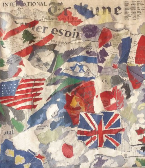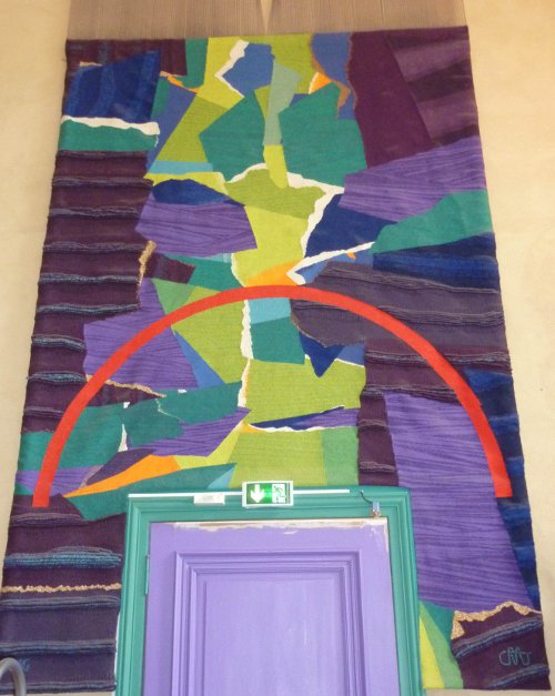 La première (celle de Mireille Guérin) est une tapisserie abstraite jouant sur des contrastes colorés simulant des papiers déchirés. Elle encadre le haut de la porte du CDI et sa découpe montre qu’elle a été pensée pour être placée à cet endroit-là.