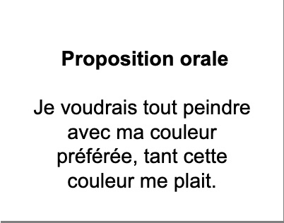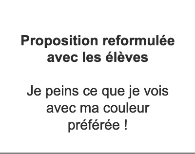Alors que les travaux sèchent, un « regard écrit » sur leur travail puis un échange à l’oral par îlot sont proposés. Les mots clés et le vocabulaire convoqués permettent de construire des phrases, de donner du sens sur leur action en utilisant un vocabulaire approprié.