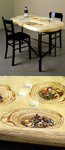 A-Z Carpet Furniture (1992) : Zittel écrit dans un catalogue qui se veut brochure commerciale : « Le lit-tapis. Elégance, économie et juste la bonne énergie. Complet. Déroulez-le, posez-le. Changez de place en toute liberté aussi souvent que vous l'avez rêvé. » A-Z Raugh Dishless Dining Table (1999) : des assiettes creusées à même le bois, une table au relief vallonné, un tête à tête sans vaisselle.