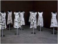 Study for A-Z Cellular Compartiment Unit #6 (2002) : une étude pour des cellules d'habitation modulables. De l'individuel au collectif, dans l'esprit de l'idéal moderniste et des utopies sociales. A-Z Fiber Form Uniform (2002) : des uniformes en laine aux formes organiques.
