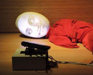 Il projette l'image sur différents supports, boîtes ou boules en fibre de verre, murs, marionnettes, mannequins, poupées inanimées, posées à même le sol ou mises en scène dans l'espace de l'exposition.