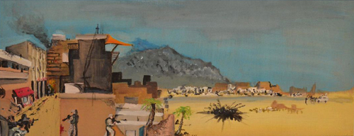 Cette donc cette idée que j'ai retenu, de sur-médiatisation et d'usage intensif des nouvelles technologies qui en fait voulait masquer la réalité physique de toute guerre : la mort de centaines de milliers d'hommes et femmes. Mon travail est donc conçu comme une double image avec un format panoramique ; d'un coté une scène en deux temps avec le conflit entre soldats américains et iraquiens et les médias à l'écart tournant un « reportage » sur cette guerre. De l'autre coté j'ai peint des visages d'acteurs ou victimes de cette guerre comme sortant de l'ombre. J'ai choisi le bois comme support et en m'appuyant sur des photographies d'époque, j'ai essayé de traduire ces deux réalités en utilisant des contrastes, d'échelle, de couleurs, de noir et blanc mais aussi des touches et des taches de couleurs, comme quelque chose de mouvant. J'ai conçu la scène de guerre et des médias comme une fausse réalité ; peut-être lié à mon goût pour la réalité virtuelle de l'univers vidéo. De l'autre coté du tableau, j'ai représenté des visages clairs, fantomatiques émergeant d'un fond noir préalablement peint (un peu comme le fait Courbet) comme si ces figures (acteurs ou victimes du conflit) simplifiées apparaissaient sous le feu des projecteurs. Cette partie sombre de mon projet fonctionne un peu comme une peinture de mémoire pour les victimes mais aussi comme l'envers du décor diffusé par les médias. (Aurélien)