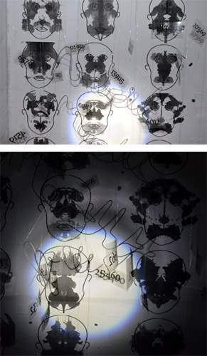 Puis nous décidons de réaliser d'autres éléments de mémoire en reprenant l'inscription « Arbeit macht frei » (situé à l'entrée du camp d'Auschwitz) et « écrite » en fil de fer puis suspendue au centre de l'installation ; le deuxième élément consiste en une série de chiffres photocopiés sur du film transparent et suspendus autour de l'inscription, ces chiffres renvoient aux matricules imposés aux prisonniers. Le tout est éclairé ponctuellement à l'aide d'une lampe torche mise à disposition du spectateur quand il rentre dans la pièce. Enfin pour structurer l'ensemble nous prenons la décision de fabriquer une forme de cadre constitué d'autres exemplaires des photocopies de visages-masques, comme une fragile limite visuelle de l'ensemble. Le spectateur est invité à faire librement l'expérience des ténèbres et à comprendre en fonction de sa propre histoire et de sa culture.(Cassandre et Folavril)