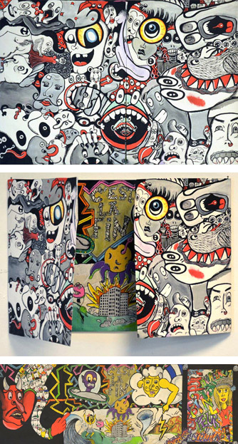 Mélaine est de nature rieuse et positive et comme en écho à ces délicieuses dispositions, elle aime à représenter le monde dans un registre emprunté au monde de la bande dessinée. Le choix du 21 décembre 2012 comme annonce d'une fin du monde fortement médiatisée et comme thème d'une « dernière » peinture d'histoire n'est ni anodin ni gratuit. Ce choix insolite vaut comme clin d'œil malicieux à « Un enterrement à Ornans » de Courbet (étudié en amorce de la leçon) mais surtout invite Mélaine à se frotter aux grands classiques de la peinture religieuse européenne. Mélaine en retient, comme par exemple chez Jérôme Bosch dans le « Jardin des Délices », leurs manières singulières de figurer les derniers moments de l'humanité, leurs choix des formats en volets articulés et en séquences narratives. Mélaine opte pour le triptyque articulé, le stylo Posca, l'opposition du noir et blanc et des couleurs et de multiples sources iconographiques. Ce contenu s'accommode très librement des processus de prolifération, de superposition et de saturation du champ pictural propre à l'univers figuratif de Erro.