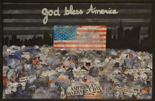 J'ai donc décidé de représenter la fracture et la déchirure de ce pays suite aux événements du 11 septembre 2001 ; événement majeur dans l'histoire des États-Unis ayant changé le mode de vie des américains, la vision du monde et l'ordre géopolitique mondial. J'ai donc utilisé des photos couleurs déchirées du 11 septembre (World Trade Center, Pentagone, crash du vol 93, décombres...) et des fragments d'articles de journaux. Les morceaux de photos sont comme tombants vers le sol afin de rappeler les débris, ils signifient aussi plus largement, le désordre mondial que cet événement a occasionné et valent comme métaphore de la situation des États-Unis après le 11 septembre. Au centre, le drapeau des États Unis se retrouve sali, terni comme un acteur endeuillé et meurtri, comme bloqué dans les gravats. En arrière-plan, une vue panoramique de New York plongée dans des ténèbres barrées d'éléments en grisaille du drapeau américain comme une mise en abyme de l'événement.