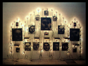 Encadrant l'ensemble et le quadrillant tout à la fois, une multitude d'ampoules nues alimentées par un grand nombres de fils volontairement visibles (certains passent par dessus les images) éclairent l'ensemble d'une lumière blanche et jaunâtre.