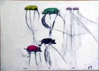 feuilles de papier 24x32cm (format 4/3 comme l'écran de télé correspondant au film), gouaches et pinceaux.