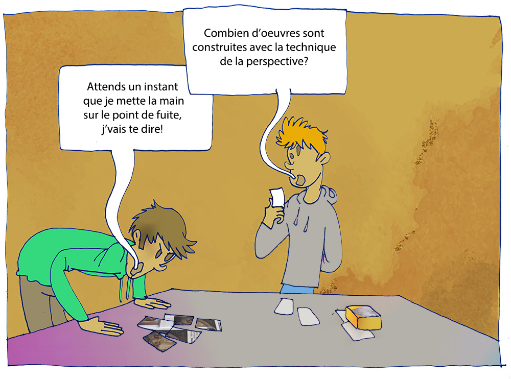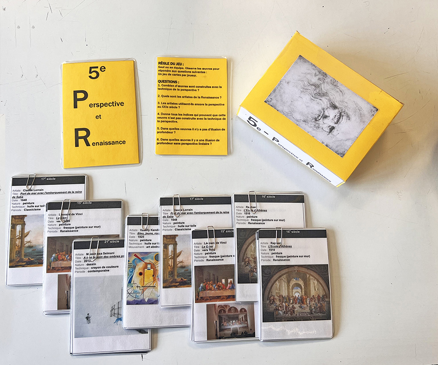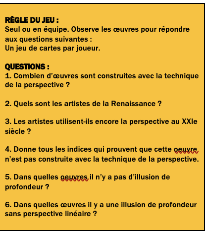 Ce jeu est né d’un besoin de faire un bilan de connaissances avec les classes du niveau cinquième à l’issue d’une séquence autour de l’illusion de profondeur. Sans vouloir faire d’évaluation sommative, ce moment a permis aux élèves de convoquer leurs souvenirs au travers d’œuvre vues précédemment, œuvres intégrées au jeu.