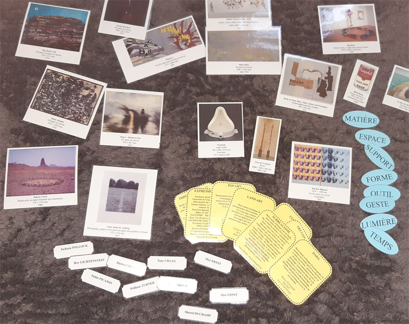 Afin de préparer au mieux les élèves de 4ème à la visite de la Tate Modern à Londres, un jeu sérieux inventé pour permettre aux élèves de remobiliser leurs connaissances passées. Pour jouer, les élèves ont la possibilité d'utiliser leur cahier d'arts plastiques qui regroupe les fiches de références artistiques depuis la 6ème ainsi que leur porte-vues où ils gardent leurs recherches sur les "oeuvres du mois" ainsi que la documentation de classe (notions, cartes heuristiques, ouvrages,..) |