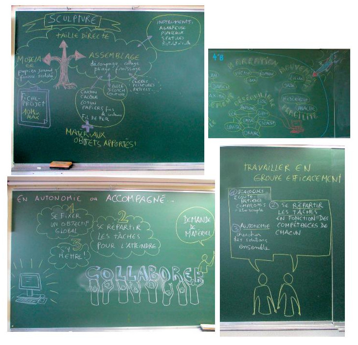 Une fois toutes ces idées tracées au tableau, un plan de travail et une fiche projet sont distribués aux élèves, afin de leur permettre de penser et choisir leur projet. Les écrits sont adaptés selon trois profils d'élèves: ceux qui saisissent très rapidement et qui ont besoin de peu de précisions, ceux qui éprouvent quelques difficultés à l'écrit et ceux qui ont uniquement des schémas.