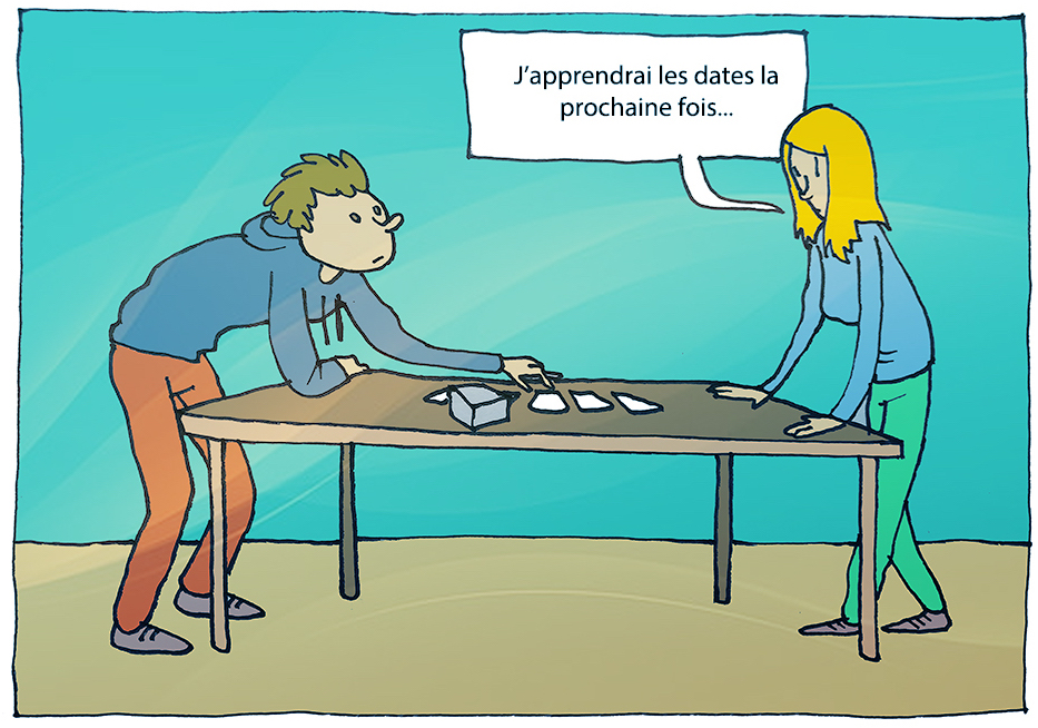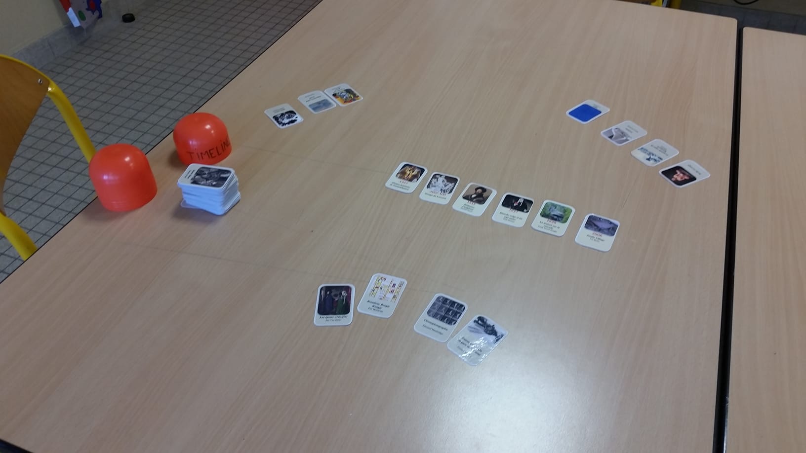 Une carte de la pioche est posée sur la table face date visible, à tour de rôle, les élèves essaient de placer une de leur carte au bon endroit en fonction de la date présumée dans la ligne temporelle qui se constitue.