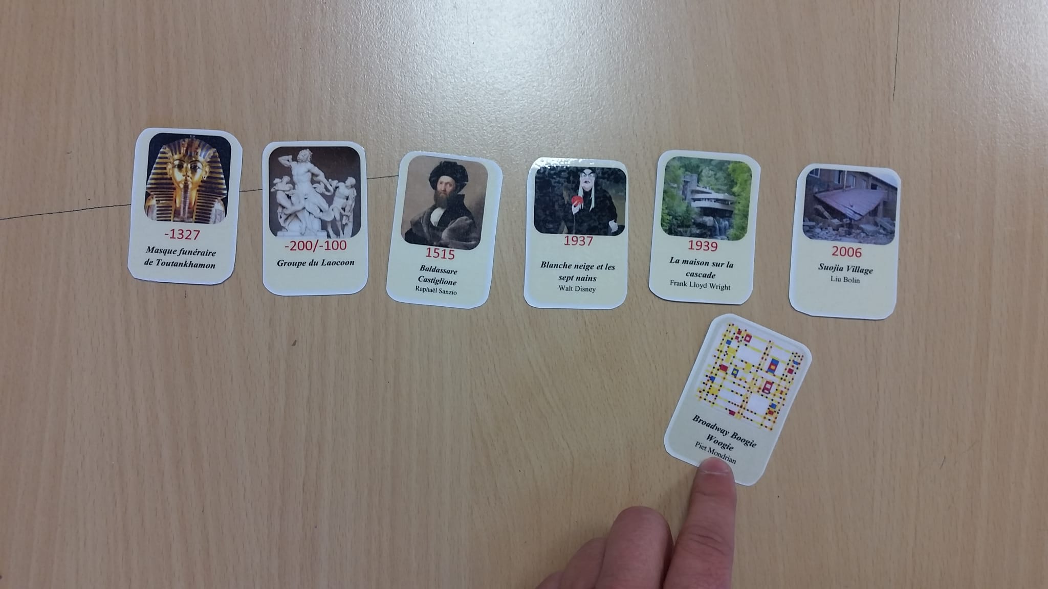 Inspiré de la gamme "Timeline", cette proposition créée par un professeur d'arts plastiques, allie des connaissances et parfois de bonnes intuitions. Avec une règle du jeu maîtrisée en quelques minutes, ce dispositif léger permet de situer dans le temps des repères artistiques, en écho avec les apprentissages de la classe.