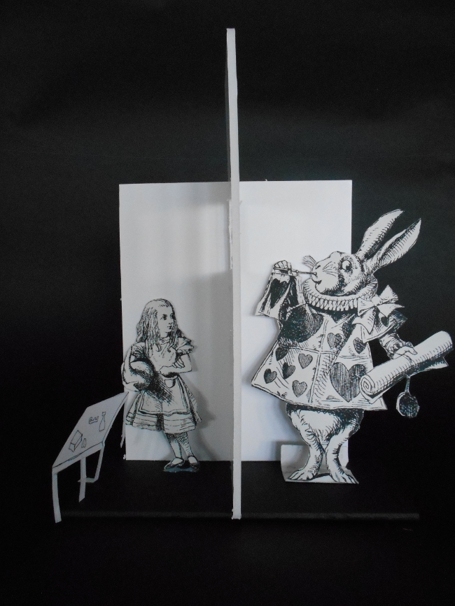 D'un coup Alice rapetissa De l’autre côté de la vitre, apeuré, le lapin se tira fissa Pas assez d'audace pour lui faire la cour au nez Il préféra fuir en rêvant de la couronner
