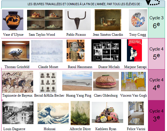 Les enseignants renseignent en début d'année un projet axé sur les oeuvres de références travaillées régulièrement au cours des années et reconnues par tous les élèves en fin de parcours. La fiche projet, à savoir un recto-verso pré-rempli, est à télécharger ici.