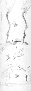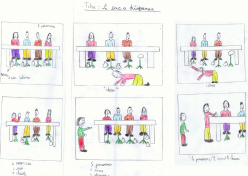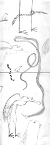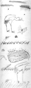 Si, pour la majorité des élèves, le premier dessin montrait l'animal dans sa totalité, plus de la moitié d'entre eux, firent le choix d'un gros plan pour le second. Il ne leur avait pas été demandé précisément de faire ce choix mais simplement suggéré de changer la dimension de l'oiseau. Nous savons pourtant bien que lorsque nous demandons à des élèves de faire un story board pour préparer un travail, ils n'utilisent que très rarement des plans différents, même si on le leur suggère. ( voir la leçon : il s'est passé quelque chose dans la salle d'arts plastiques)