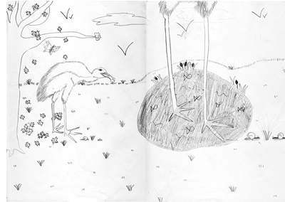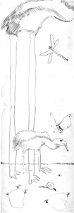 Les mêmes élèves , en cinquième, ont eu à construire un dessin en représentant deux fois un même élément (voir la même leçon avec une grenouille) et en le complétant ensuite pour donner du sens aux éléments représentés. Les élèves n'avaient connaissance de ce qu'il devaient faire qu'au fur et à mesure : 1. représentez l'oiseau qui est projeté sur une feuille A4 2. représentez ce même oiseau une seconde fois, sur une autre feuille A4 , pas forcément au même emplacement , ni de la même taille. 3. assemblez vos deux dessins pour qu'ils ne fassent plus qu'un et complétez pour donner du sens à ce que vous avez commencé.