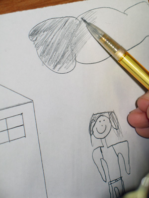 Le support, qui n'est que partiellement couvert par le dessin est lui-même malmené. La feuille, arrachée d'un cahier garde les traces visibles de la déchirure, et a été maladroitement découpée dans le coin inférieur droit. Le support ici "travaillé" devient un élément primordial du travail de l'artiste, élément qui sera dés lors interrogé lors d'une séance prochaine