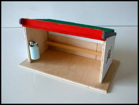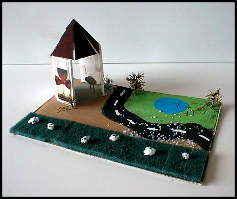 - matériaux de la maquette : bois, matière isolante avec une surface métallisée, tapisserie en trompe l'œil (béton), une réglette en plastique (banc), des sucres peints en vert (pelouse du toit), un bouchon (poubelle)