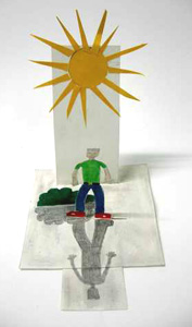 Je voulais en ce début d'année de cinquième amener les élèves, non pas à saisir pleinement la notion multiple de l'espace, mais plutôt d'en saisir sa complexité et surtout ses possibilités combinatoires à travers une série de leçons. Les verbalisations auront permis d'aborder un certain nombre de questions et notions, de mots de vocabulaire comme par exemple la différence entre relief et volume dans leur rapport à l'espace à 2 et à 3 dimensions, la place du spectateur, la notion de planéité.