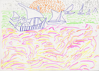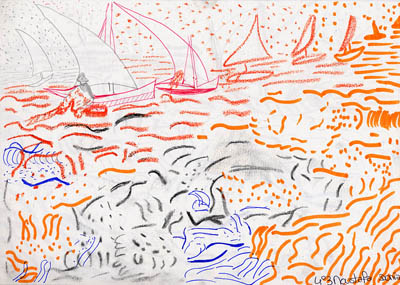 Leur comportement était intéressé, face à la découverte de l'oeuvre. Ils ont bien aimé cette scène maritime. Ils ont très facilement décrit l'oeuvre et leur travail en utilisant des termes de dessin (traits, points, lignes courbes, droites, contours...).