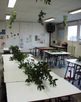 des branches de laurier sont posées sur les tables avant l'arrivée des élèves