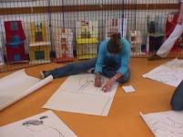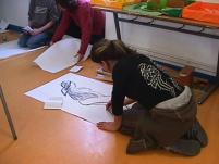 D'autres questions se sont posées comme le choix d'une technique, le crayon à papier ne se révélant plus très approprié pour un papier brun et de grands traits souvent moins appuyés du fait de l'amplitude et de la vitesse du geste ; mais aussi comme le type de représentation du corps humain. C'est alors que certains se sont rendus compte qu'ils travaillaient leur grand format par morceaux, penchés dessus à tel point qu'ils occultaient une bonne partie du support par leur bras, leur matériel, ou la feuille des voisins. J'ai d'ailleurs été surprise de cette réticence à changer de posture et de manière de dessiner, particulièrement importante dans une des deux classes avec lesquelles j'ai fait cette leçon. Et les questions qui se sont alors posées n'ont pas été alors tout à fait de l'ordre de celles que je m'attendais à voir émerger : plus que l'importance du geste sur le trait, c'est la fragmentation du dessin qui est apparue. Dans ce cas précis, la représentation s'est faite par fragment, sans vison globale ni du support ni du dessin et elle ne ressemble plus qu'à peine au dessin d'origine sur le carnet, ni aux proportions habituelles du corps humain.